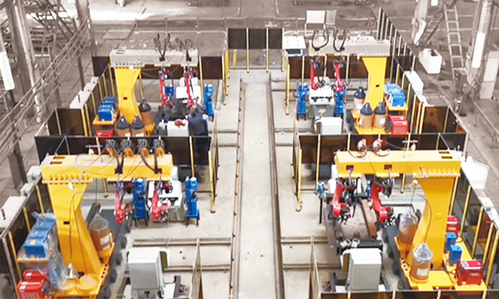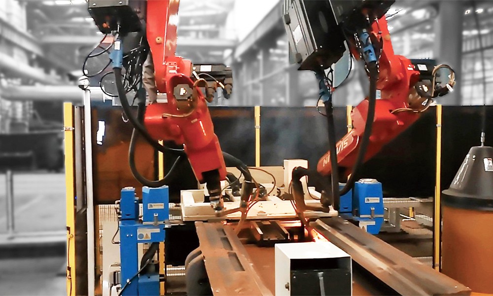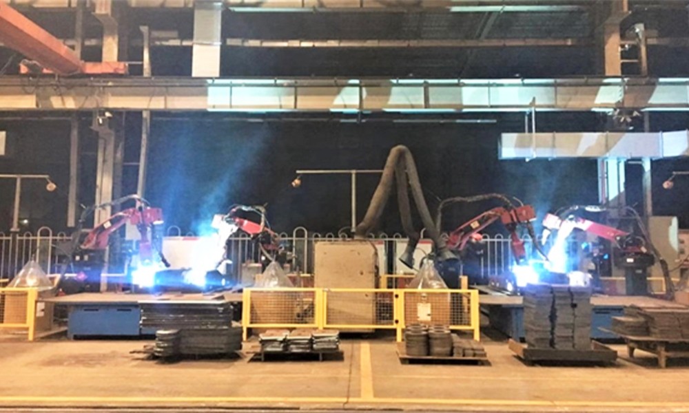新松打造刮板輸送機(jī)中部槽大型結(jié)構(gòu)件機(jī)器人自動(dòng)焊接生產(chǎn)線,主要包括機(jī)器人智能焊接工作站、智能物流輸送系統(tǒng)、車間層智能管理與控制系統(tǒng)三部分。